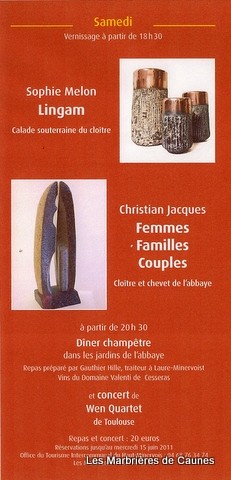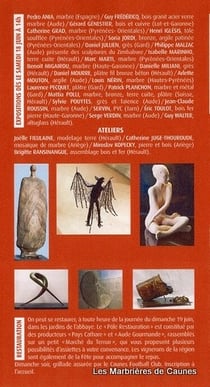 et métal (Gard) / Mattia POLLI, marbre, bronze, terre cuite, plâtre (Suisse, Hérault) / Sylvie POUYTES, grès et faïence (Aude) / Jean-Claude ROUSSIN , marbre (Aude) / SERVIN, PVC (Tarn)