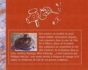 présente des sculptures du Zimbabwe / Isabelle MARINHO, terre cuite (Hérault) / Marc MARTI, marbre (Pyrénées-Orientales) / Benoît MIGAIROU, marbre (Haute-Garonne) / Danielle MILIANI, grès